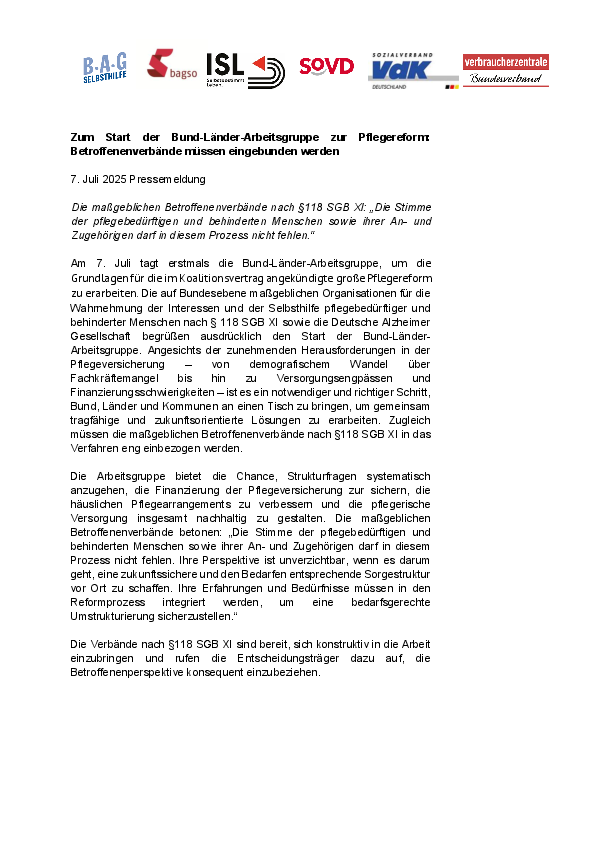 Zum Start der Bund-Länder-Arbeitsgruppe kritisierten zahlreiche Organisationen die fehlende Einbindung der Betroffenenverbände. Die gemeinsame Pressemitteilung von BAG SELBSTHILFE, BAGSO – Bundesarbeitsgemeinschaft der Seniorenorganisationen, Interessenvertretung Selbstbestimmt Leben in Deutschland – ISL, Sozialverband VdK, Verbraucherzentrale Bundesverband und SoVD finden Sie hier: