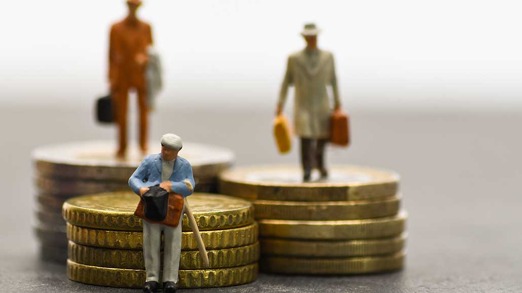 Kleine Figuren von älteren Menschen sitzen und stehen auf Münzstapeln.