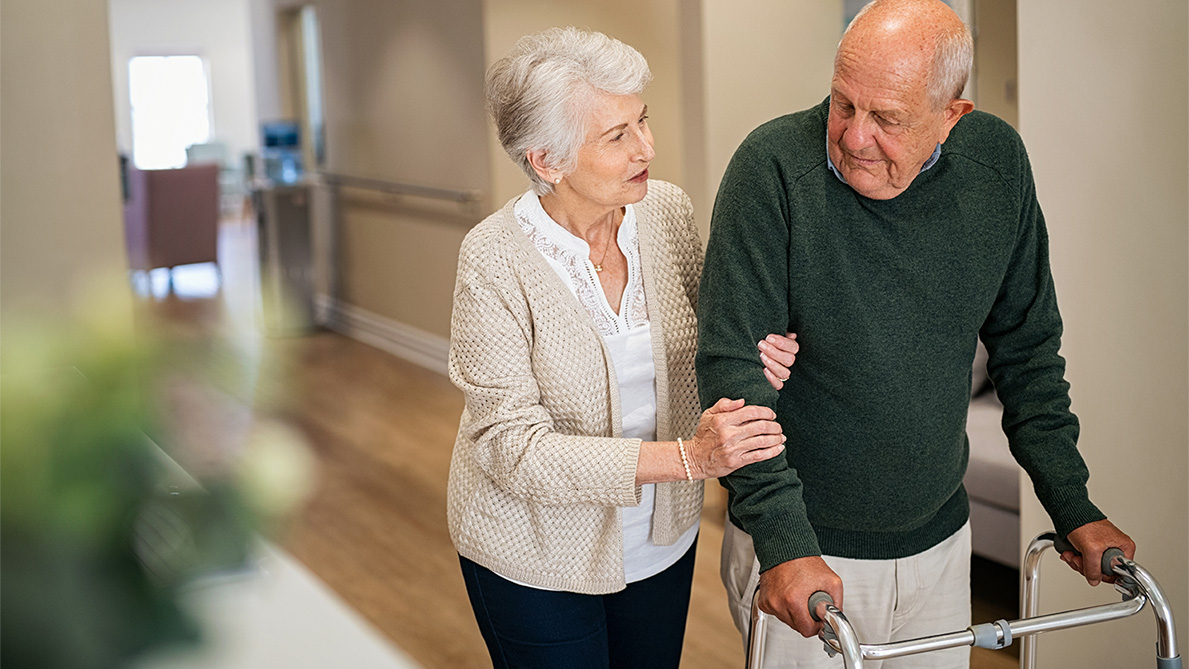 Ein älterer Mann mit Rollator und seine Frau laufen über den Gang eines Pflegeheims.