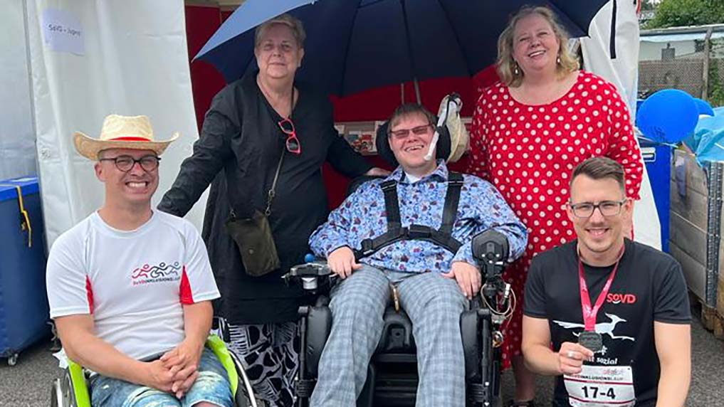 Beim SoVD-Inklusionslauf, v. li.: Beisitzer Alexander Menzel, Bundesfrauensprecherin Jutta König, Bundesjugendvorsitzender Sebastian Freese sowie Simone Real und Kevin Pusch vom Jugendreferat.