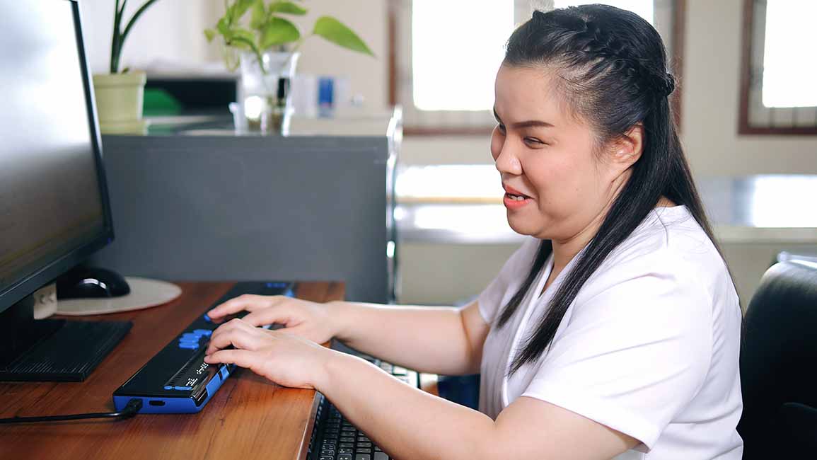 Frau mit Sehbeeinträchtigung arbeitet an einem Bildschirm.