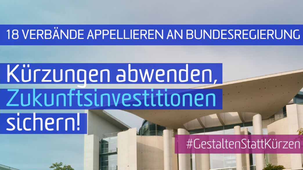 Kanzleramt in Berlin. Dazu der Text: 18 Verbände appellieren an Bundesregierung: Kürzungen abwenden, Zukunftsinvestitionen sichern!