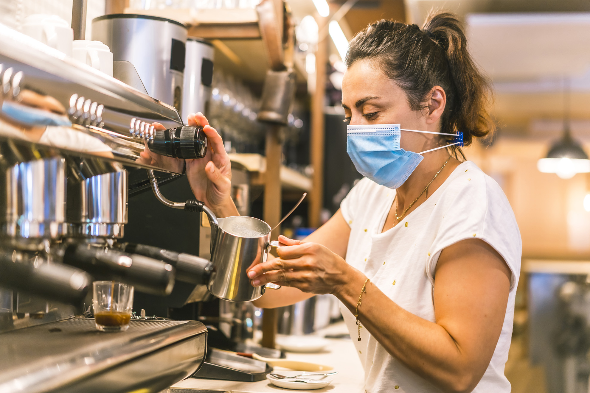 Frau in einer Bar bereitet Kaffee zu.