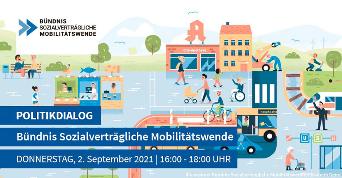 Am Donnerstag, den 2. September, von 16 bis 18 Uhr lädt das Bündnis die Politik ein, ihre Visionen für eine sozial gerechte Mobilitätswende zu diskutieren. Mit dabei sein werden: Sören Bartol (SPD), Anton Hofreiter (Bündnis 90/DIE GRÜNEN), Lukas Köhler (FDP), Amira Mohamed Ali (DIE LINKE) und Andreas Jung (CDU). Das Bündnis wird vertreten durch Christine Behle (ver.di), Kai Bliesener (IG Metall), Michael Groß (Präsident AWO) und Kerstin Haarmann (VCD). Der Politikdialog findet digital statt.