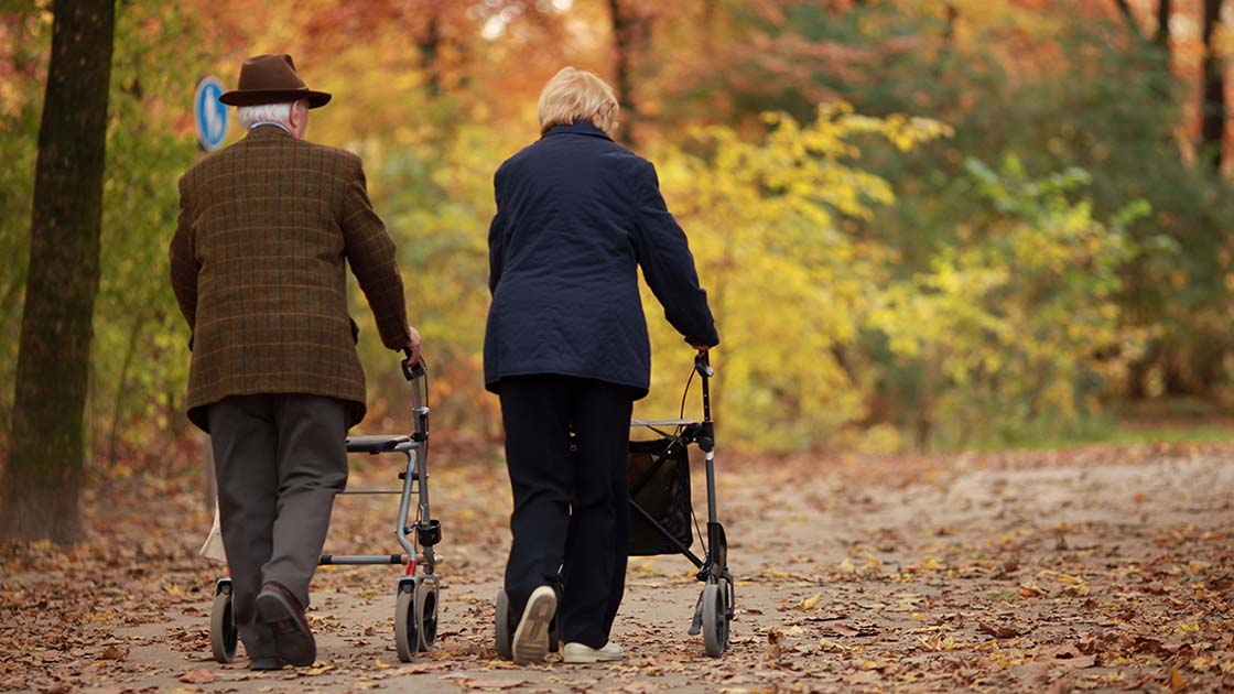 Zwei ältere Personen mit Rollatoren laufen auf einem laubbedeckten Waldweg.