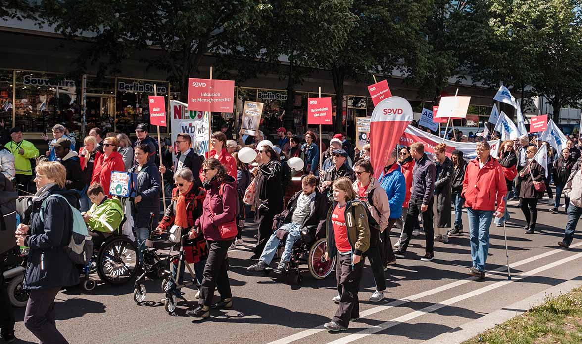 Der SoVD beteiligte sich an der bunten Demo mit vielen Teilnehmenden aus der Bundesgeschäftsstelle – darunter die SoVD-Vorstandsvorsitzende Michaela Engelmeier - sowie Mitglieder des Landesverbands Berlin-Brandenburg und die SoVD-Bundesjugendvorstandsmitglieder Sabrina Struck und Alexander Menzel. In einem Statement zum Protesttag betonte Michaela Engelmeier: „Inklusion und Teilhabe sind keine freiwilligen Aufgaben – sie sind Menschenrechte. Deshalb braucht es endlich eine gesetzliche Verpflichtung zur Barrierefreiheit auch für die Privatwirtschaft, flankiert durch finanzielle Anreize.“
