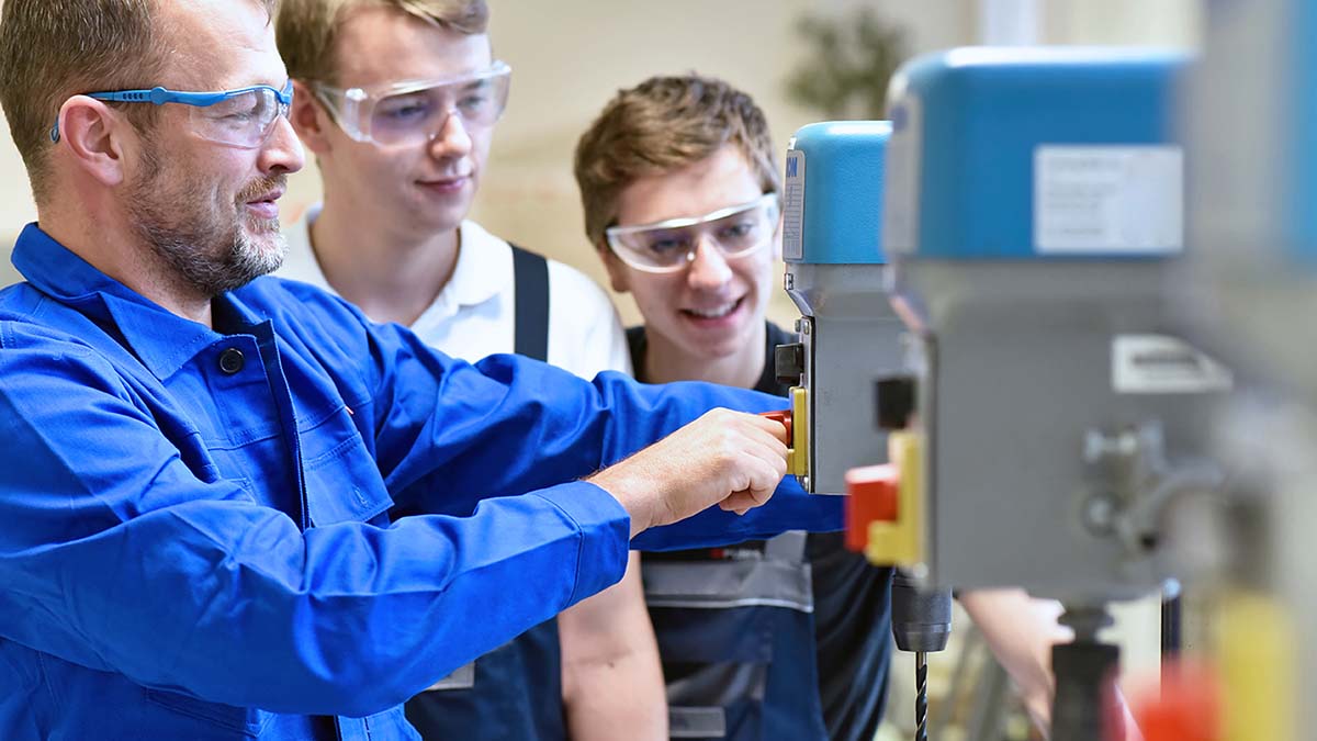 Ein älterer und zwei jüngere Männer stehen in einer Werkhalle an Maschinen.