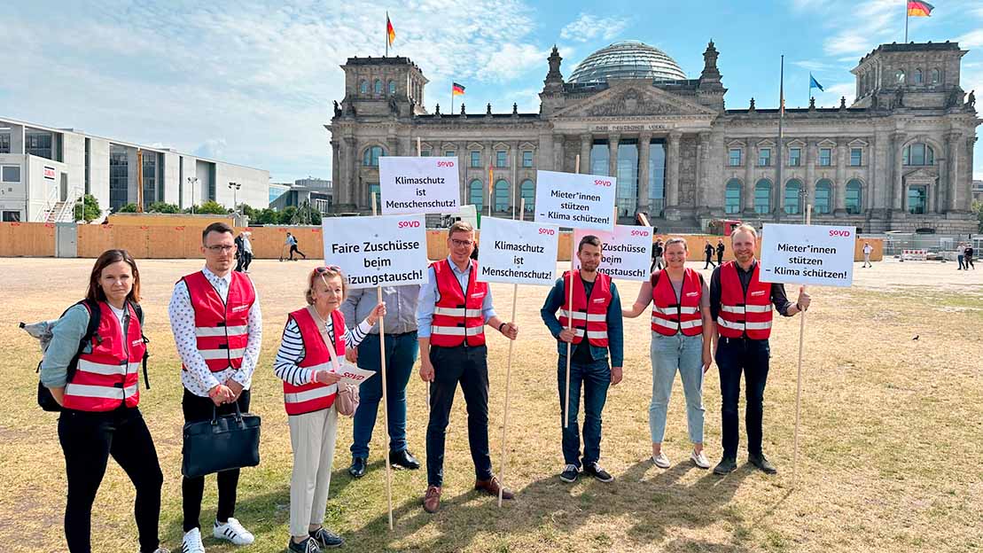 Am Donnerstag entscheidet der Bundestag über das Gesetz. Um auf die sozialpolitischen Leerstellen beim geplanten Gebäudeenergiegesetz und die drohendende Verfehlung der Klimaschutzziele aufmerksam zu machen, demonstrierten der SoVD und andere Organisationen (NABU, Paritätischer Gesamtverband, Campact, Deutsche Umwelthilfe, BUND) vor dem Berliner Reichstag. Zur Verdeutlichung ihrer Positionen wurde ein übergroßes Heizungsventil symbolisch von „Fossil“ auf „Erneuerbare“ gedreht.