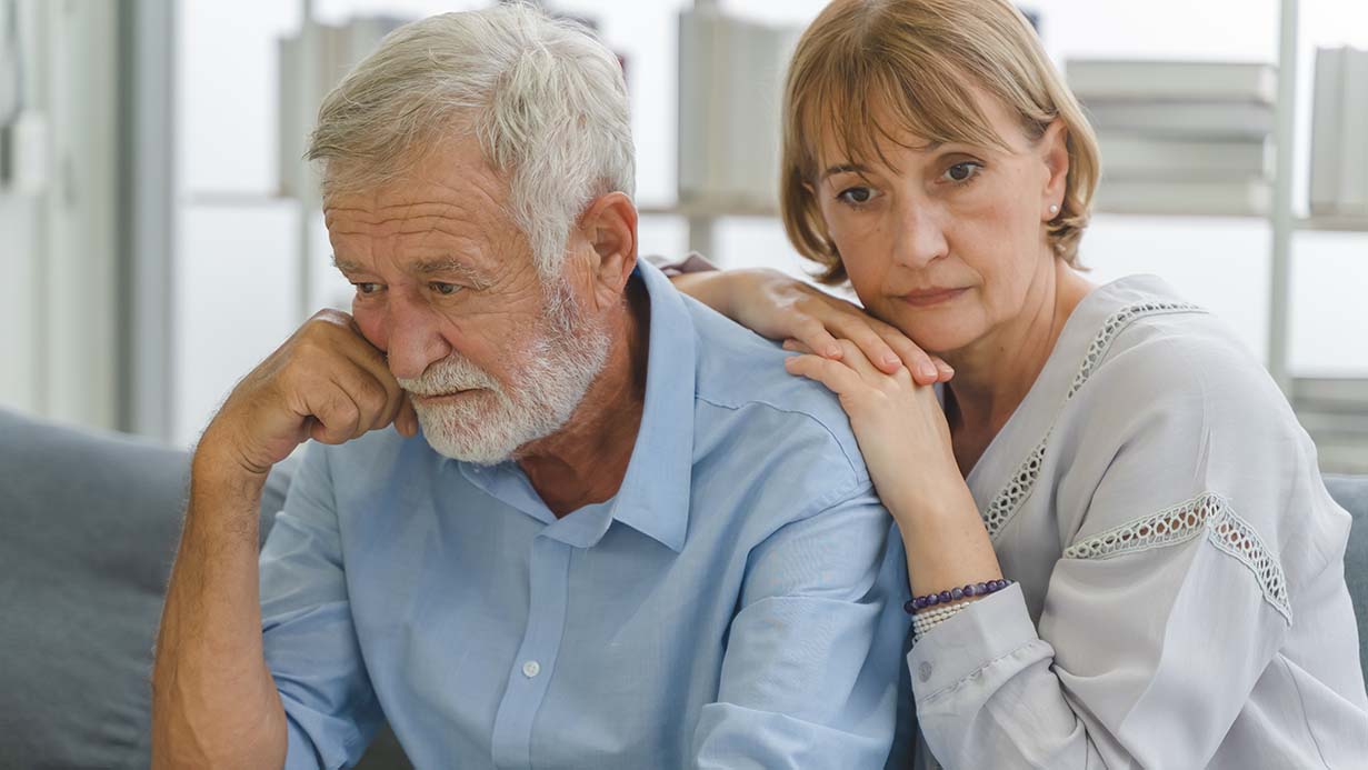 Ein älterer Mann und eine ältere Frau blicken besorgt.