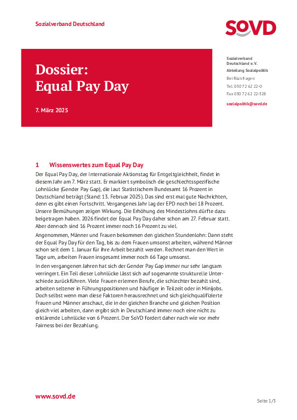 In den vergangenen Jahren hat sich der Gender Pay Gap immer nur sehr langsam verringert. Ein Teil dieser Lohnlücke lässt sich auf strukturelle Unterschiede zurückführen. Viele Frauen erlernen schlechter bezahlte Berufe, arbeiten seltener in Führungspositionen und häufiger in Teilzeit oder in Minijobs. Doch selbst wenn man diese Faktoren herausrechnet und sich gleichqualifizierte Frauen und Männer anschaut, die in der gleichen Branche und gleichen Position gleich viel arbeiten, dann ergibt sich in Deutschland immer noch eine nicht zu erklärende Lohnlücke von 6 Prozent. Der SoVD fordert daher nach wie vor mehr Fairness bei der Bezahlung. Im Dossier gibt es umfangreiche zum Entgelttransparenzgesetz und zur EU-Entgelttransparenzrichtlinie.