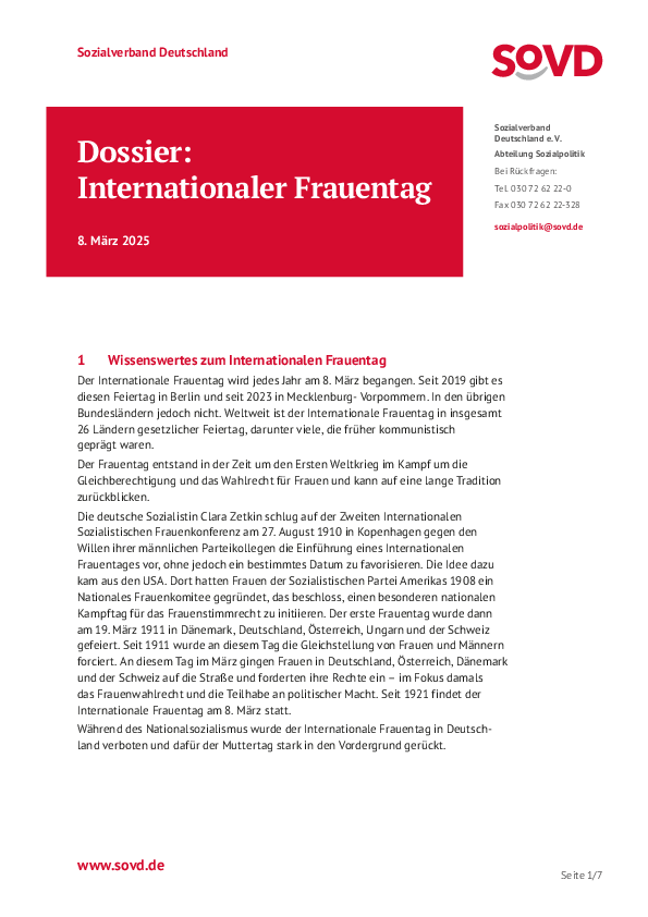 Zu allen drei Anlässen hat der SoVD umfangreiche Dossiers erarbeitet, die die Bedeutung der Tage erklären und sie mit den Forderungen des Verbandes verknüpft.