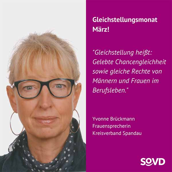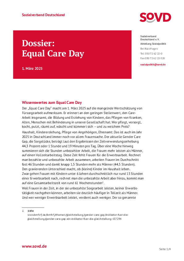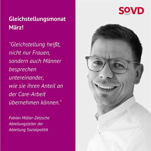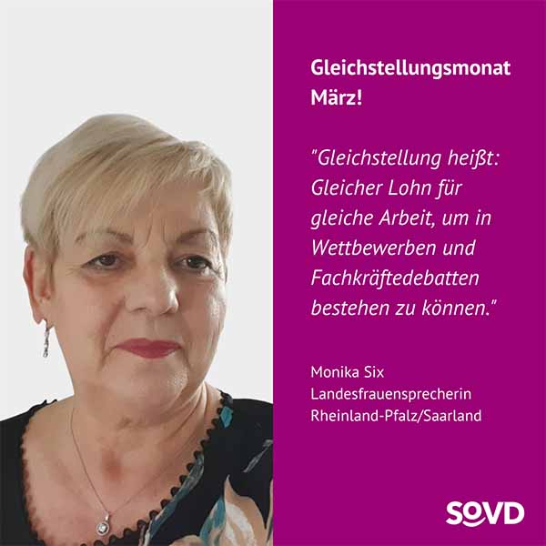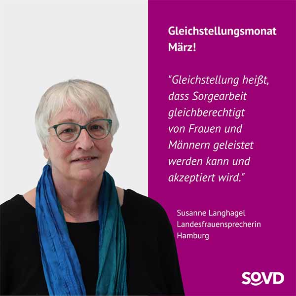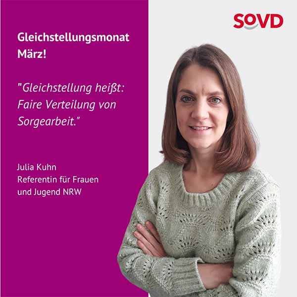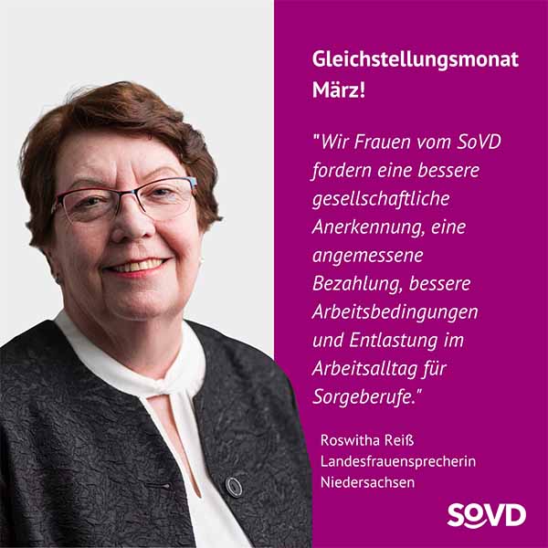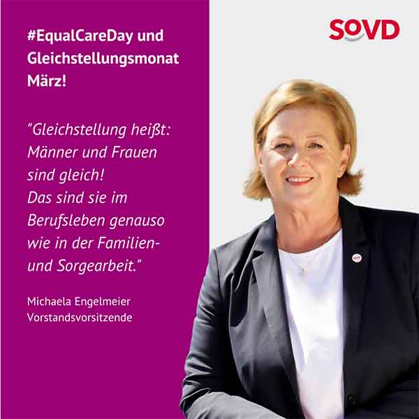 Im März machen gleich mehrere Aktionstage auf die andauernde Benachteiligung von Frauen aufmerksam. Der Equal Care Day findet am 1. März statt, der Equal Pay Day am 7. März und der Internationale Frauentag am 8. März. Die Frauen im SoVD rufen deshalb den März zum Gleichstellungsmonat aus.