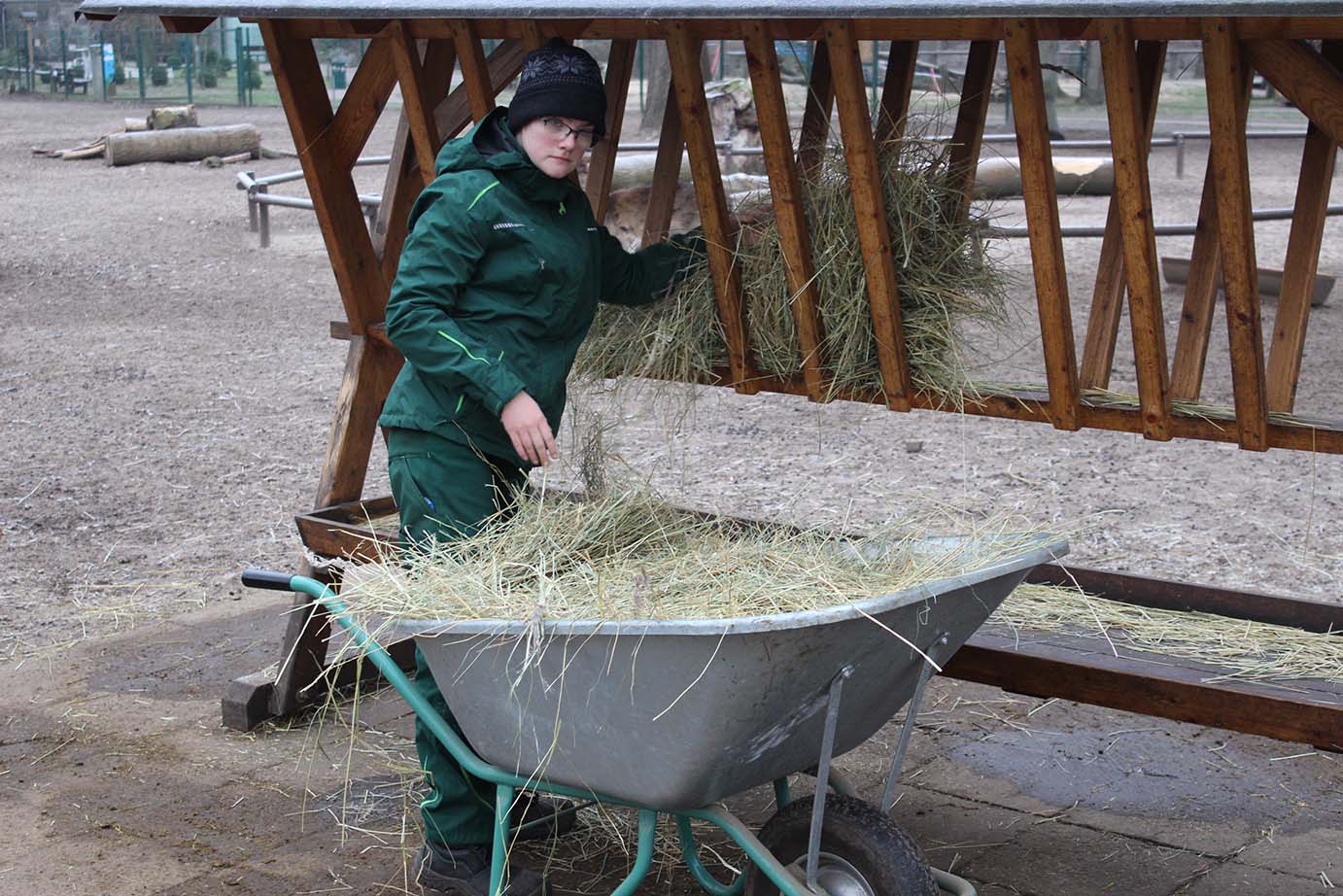 Auszubildende mit Schubkarre in einem Gehege