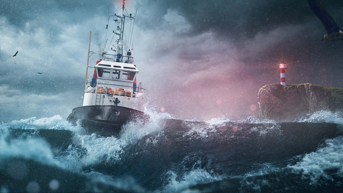 Ein Schiff in stürmischer See, im Hintergrund ein Leuchtturm.