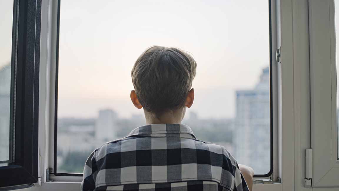 Rückansicht von einem Kind, das aus dem Fenster schaut.