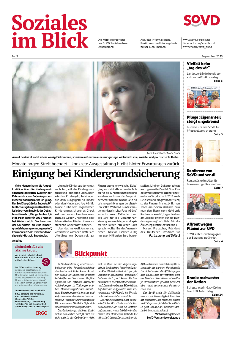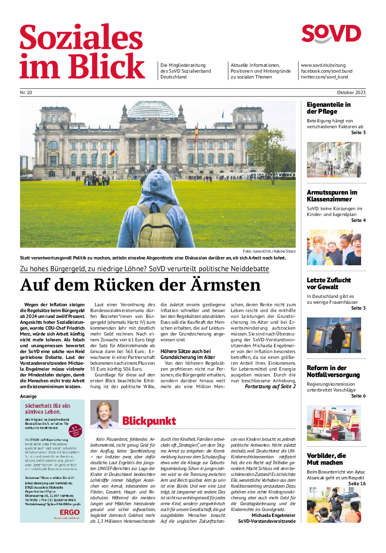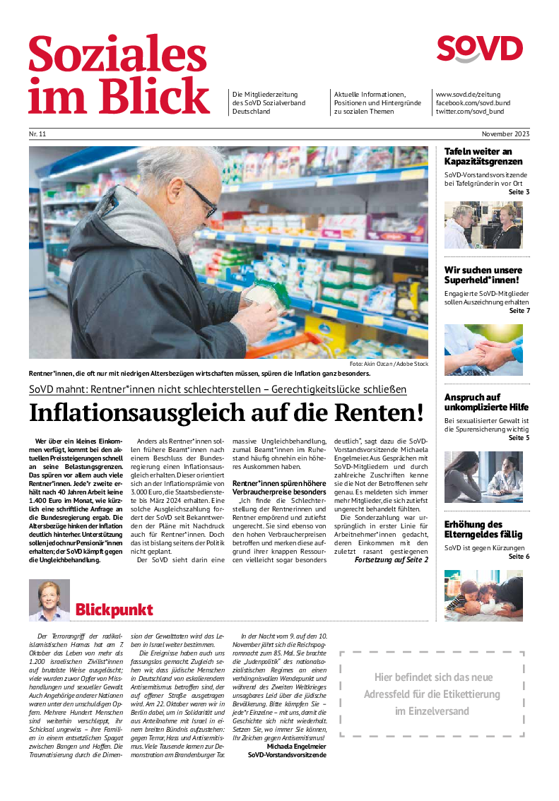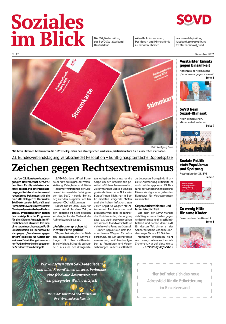 "Soziales im Blick", die Mitgliederzeitung des Sozialverband Deutschland, erscheint monatlich. Sie berichtet über das aktuelle Geschehen in der Sozialpolitik sowie Neuigkeiten aus dem Verband und hat einen Unterhaltungsteil. Alle Ausgaben ab Februar 2025 liegen als barrierefreies PDF vor.