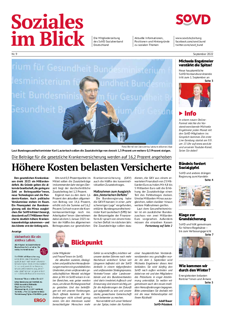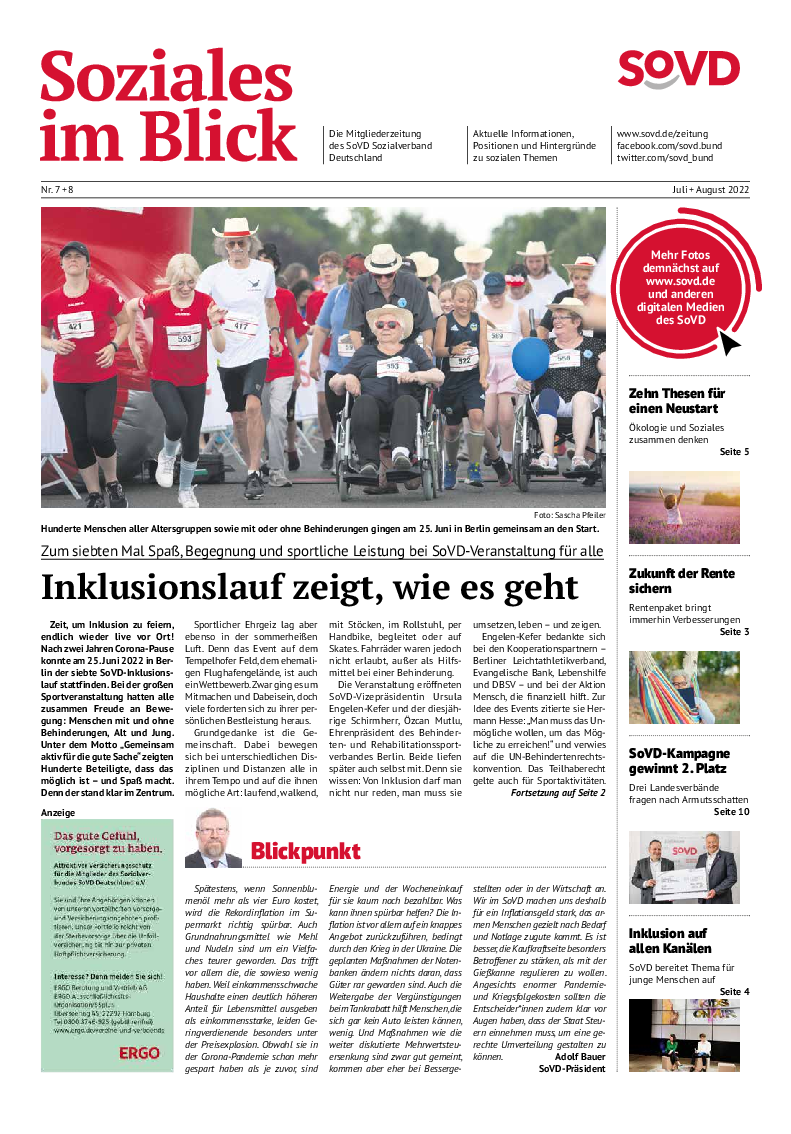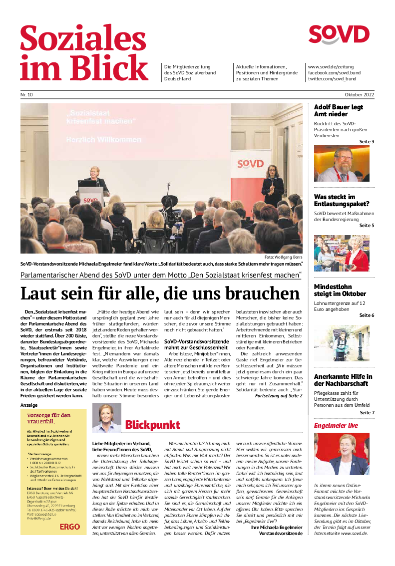 "Soziales im Blick", die Mitgliederzeitung des Sozialverband Deutschland, erscheint monatlich. Sie berichtet über das aktuelle Geschehen in der Sozialpolitik sowie Neuigkeiten aus dem Verband und hat einen Unterhaltungsteil. Alle Ausgaben ab Februar 2025 liegen als barrierefreies PDF vor.