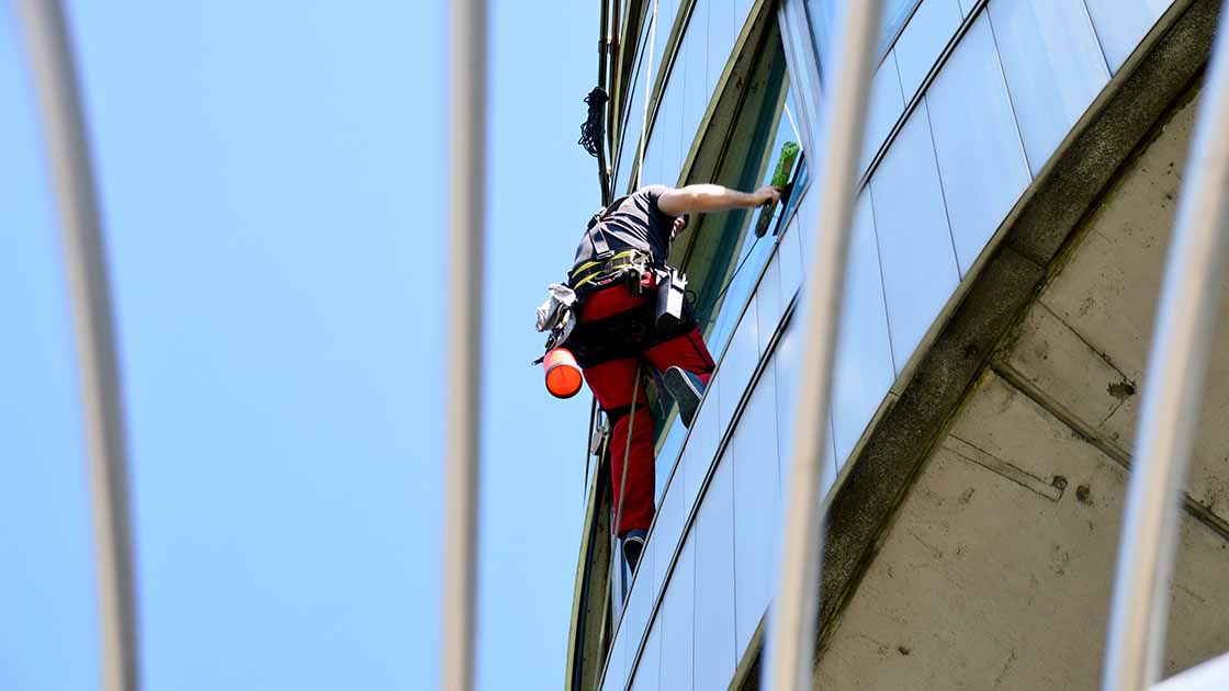 Fassadenreiniger putzt Fenster an einem hohen Gebäude.
